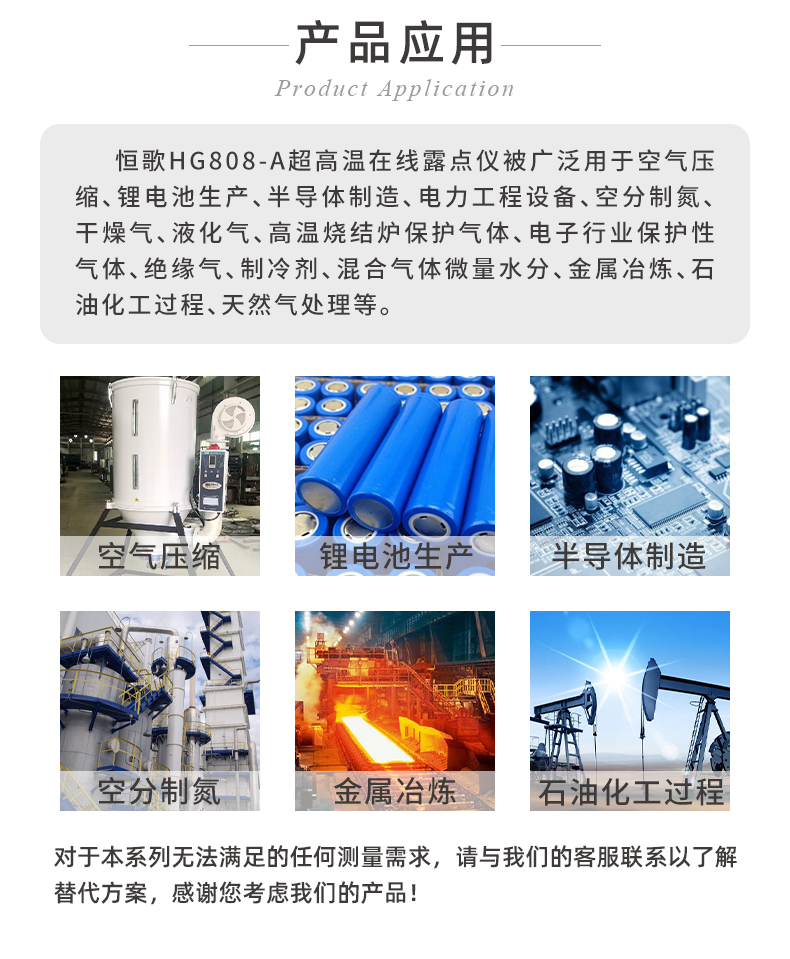 恒歌HG808-A系列在線露點變送器專為高溫干燥環境中的露點測量而設計,在高達160°C的溫度下擁有優秀的露點測量精度,即使在190°℃的溫度下仍然能安全工作。此外,其在應對各類工業極端環境時,具有一定的抗干擾、耐腐蝕、防塵防污染的性能。也因此被客戶廣泛用于空氣壓縮、鋰電池生產、半導體制造、電力工程設備、空分制氮、電子行業保護性氣體等場景進行露點測量。