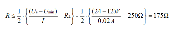 ? ? ? ? 根據這個公式,可以計算出在變送器處于低工作電壓時,大的導線電阻。假設:已知:Ue=24V,I=20mA,RL=250Ω,Umin=12V。求出r的大值為175Ω: